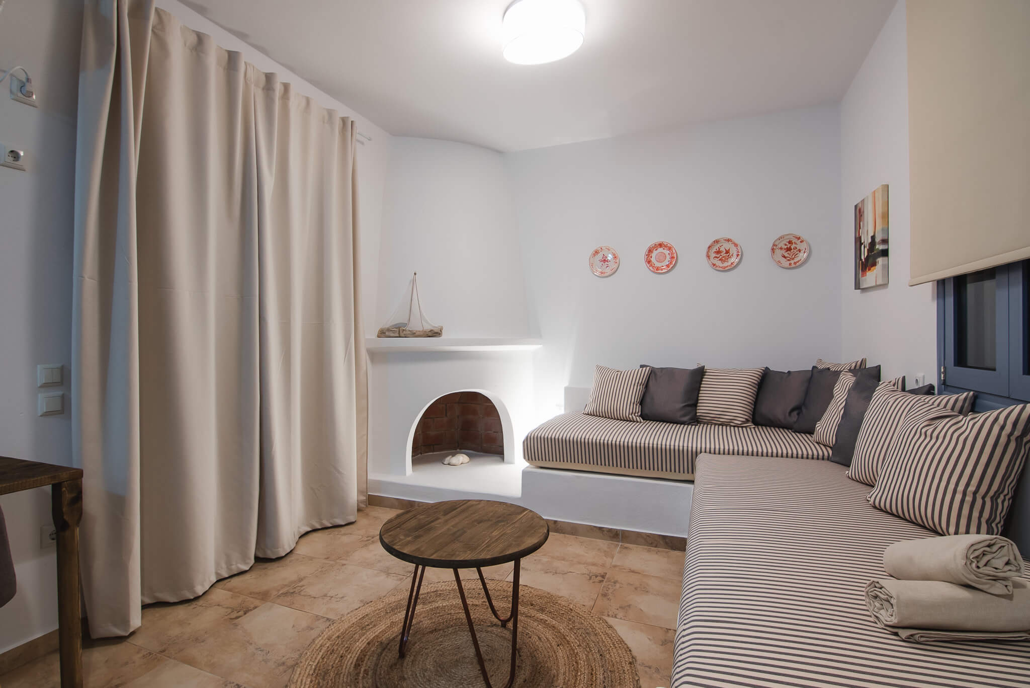 Τα διαμερίσματα βρίσκονται στον 1ο όροφο του καταλύματος και αποτελούνται από δυο χωριστά ευρύχωρα δωμάτια. Με μεγάλα ιδιωτικά μπαλκόνια και πανοραμική θέα στη χώρα της Σκύρου και τη θάλασσα, τα διαμερίσματα αυτά έχουν σύγχρονη αισθητική και προσφέρουν μια μοναδική σκυριανή εμπειρία.